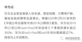 云计算,有人可能不知道,华为2019年第四季度已经是中国第三了,超越之前的金山云(算是小米系,当然没有隶属关系)。截图中为去年前三季度排名。