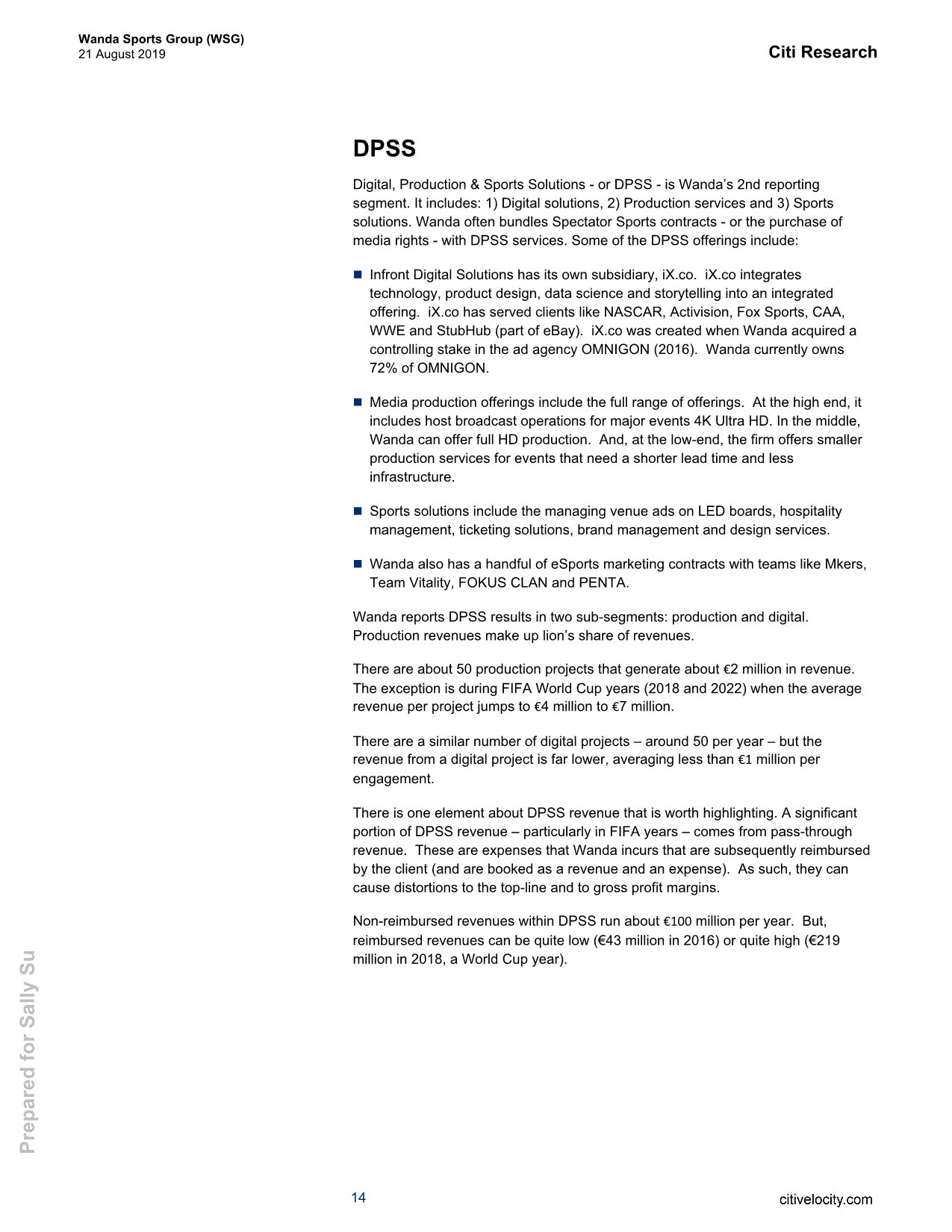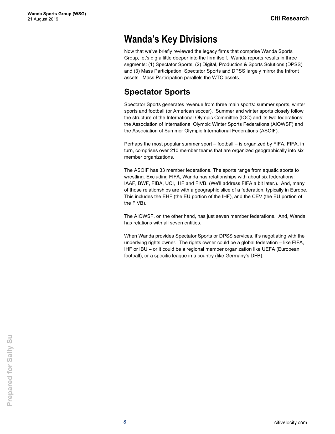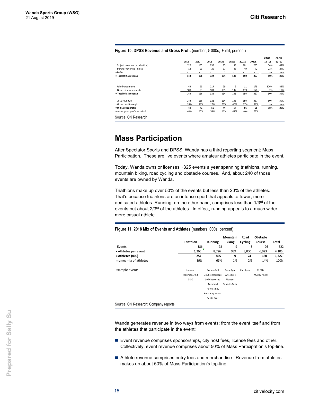 三条业务线:万达营收分为三部分,首先,在观众体育(Spectator Sports)领域,公司从第三方版权所有者那里获得合同,并将电视版权转卖给特定地区的特定体育赛事。其次,在数字、制作和体育解决方案(Digital, Production & Sports Solutions DPSS)方面,公司与版权所有者合作,确保拿到节目制作、主持人广播、营销服务和数字媒体解决方案的合同。第三,在大众参与(Mass Participation)方面,公司通常拥有像“钢铁侠”这样的体育赛事IP,并从门票销售、商品、赞助和城市主办费用中获得收入。