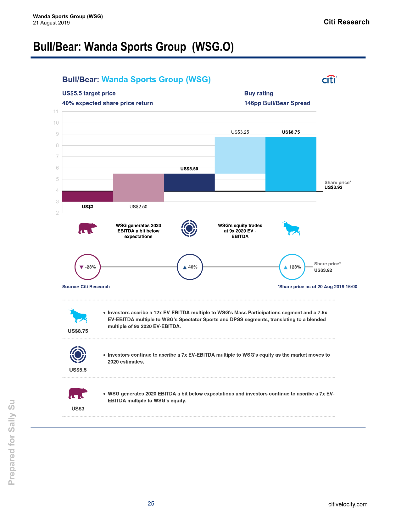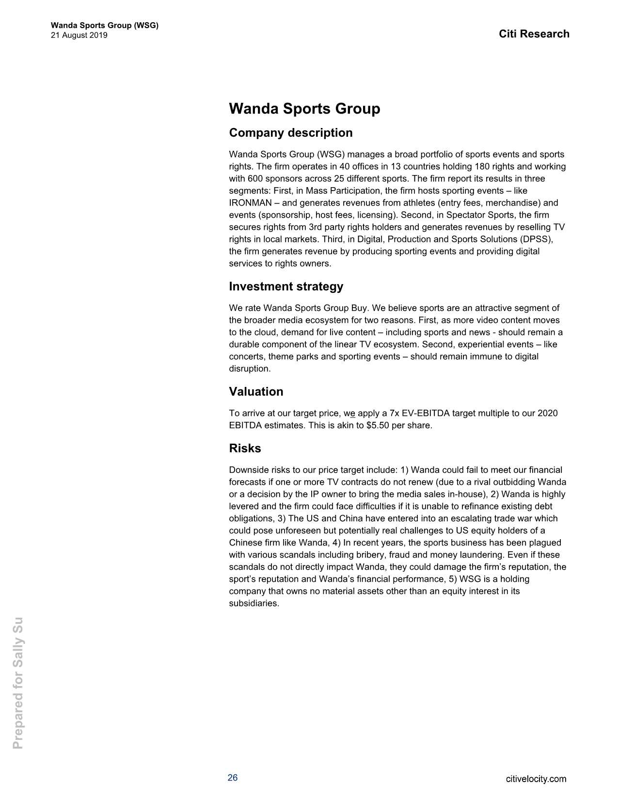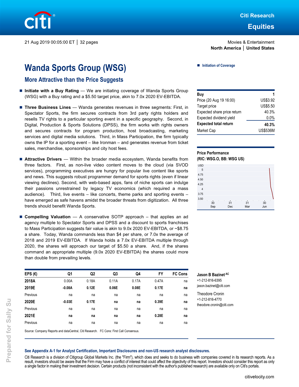 8月21日,花旗发布对万达体育(WSG.US)的研报显示,该行首予其“买入”评级,目标价为5.50美元,相当于7倍2020年的EV-EBITDA。