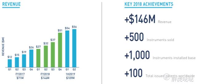 - 业务:10x Genomics开发了Chromium平台,用于高通量分析单个生物成分,Visium平台用于识别生物成分的位置和相互排列[空间分析],分子检测利用前两者提供敏感和固体将微量生物分析物转化为信号的生物化学,以及将大量原始数据处理成用户友好且易于探索的结果的软件。自2015年中期至今年6月30日首次推出产品时,该公司已向全球研究人员销售了1,284件仪器,其中全球100家研究机构中有93家出版物,前15家制药公司中有13家到2018年全球收入。