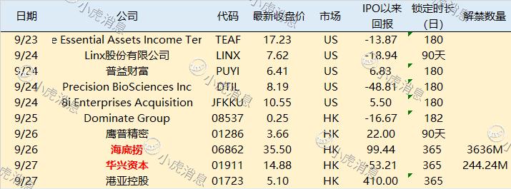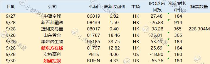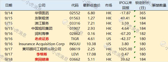 对于IPO以来回撤幅度较大的公司,解禁压力其实没那么大,只要是正常公司,管理层都不应该在股价低迷时套现。要防的,反而是那些上市以来涨幅巨大的票。海底捞$(06862)$上市以来涨幅近100%,康希诺生物$(06185)$53%,新东方在线$(01797)$25%。