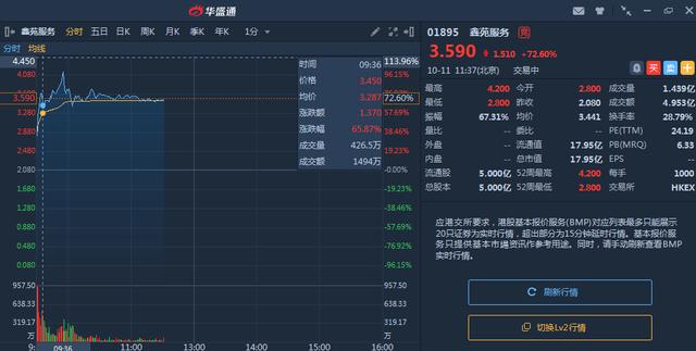 而10月11日,港股市场又迎来一只首日高开高走的新股,那就是鑫苑服务。鑫苑的走势延续了鲁大师的强势,股价开盘涨幅在34.62%,之后接近快速拉升,一度涨幅超过90%。如果按照发行价2.08港元来算,每手相当于赚到1900港元,今天鑫苑服务收盘会涨收多少值得期待!在前一天,鑫苑的暗盘表现也很不错,收涨于12.98%。