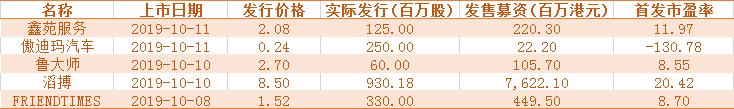 数据来源:wind,华盛证券新股浪潮来袭,如何把握机会?其实观察鲁大师和鑫苑服务的招股书你会发现,鲁大师的实际募资净额为1.05亿港元(单位下同),而鑫苑募资净额为2.2亿,在近期港交所上市的新股中属于较低的水平。其次他们都还有一个共同点,那就是不仅是盈利上市,首发的市盈率分别为8.55和11.97。可见在大市较淡的情况下,以一个较低的估值上市,对于后市的走势也有帮助。当然这个规律也并非绝对,比如女性向游戏股玩友时代(FriendTimes)上市走势后持续下挫,不过游戏公司的利润波动较大,玩友主业较为依赖于个别游戏,可能也是造成走势不强的原因。