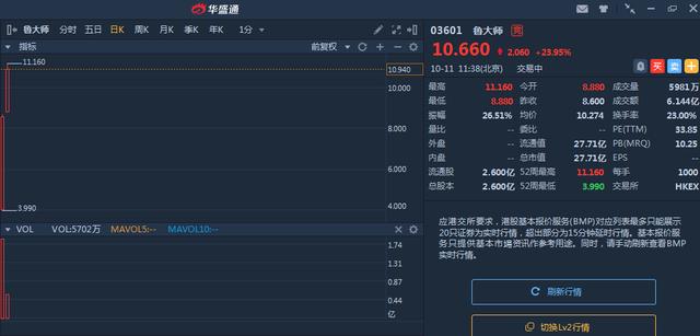 实际上在前一天的暗盘表现就可以看到其强势的苗头。在10月9日,鲁大师暗盘收涨38.89%,以每手一千股计算,中签的投资者可获利1050港元。不过鲁大师的一手中签率仅为20%,意味着这部分利润还是需要运气。但是如果你在暗盘买进仍然能吃到大肉,鲁大师上市首日高开近50%,随后涨幅一路扩大至收盘的218%。按照鲁大师发行价2.7港元来算,每手可净赚5900港元。到了10月11日,鲁大师仍然保持强势,截止发稿涨幅近24%,每手可赚7960港元!
