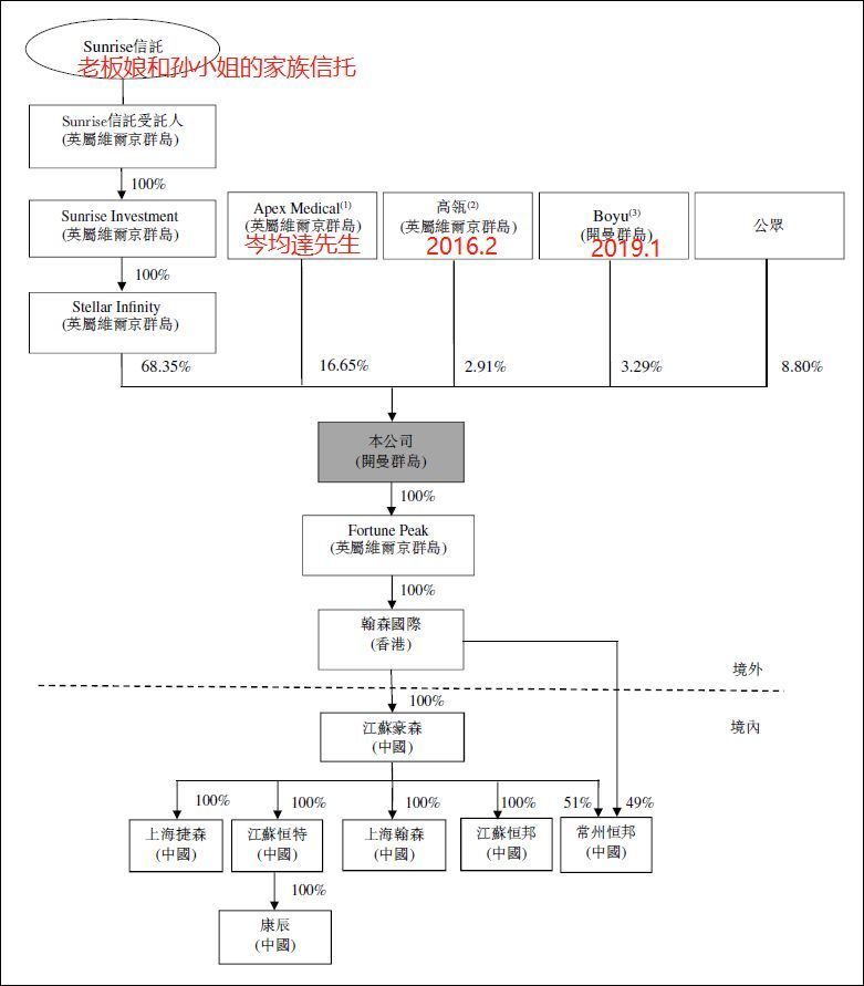 说到这,很多投资者朋友会疑问,这个老股东说的是谁呢? 第一笔40亿股息通过董事会时,老股东是老板娘钟慧娟的家族信托,岑均达先生和高瓴资本;第二笔17亿股息通过董事会时(当时未公布具体金额),老股东新进一位注册于开曼群岛的Boyu公司(专为投资翰森而成立)。翰森制药股权结构;来源:招股书