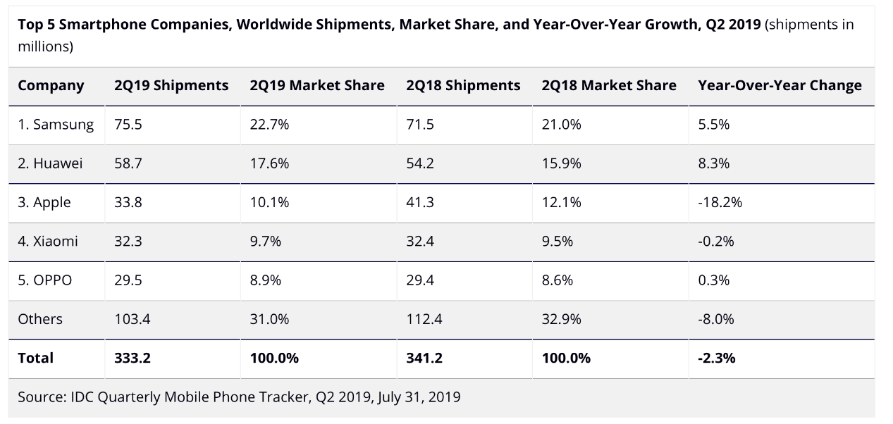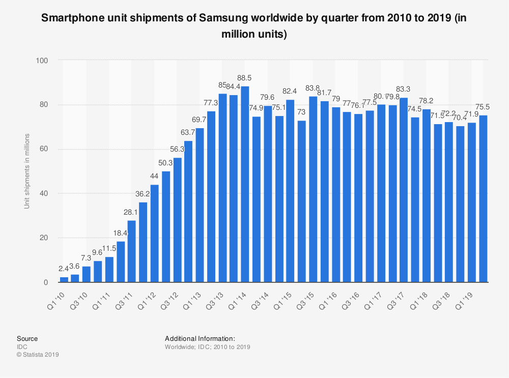 三星 SSNLF,+ 0.00%可能是移动设备的真正领头羊,因为该公司在智能手机总出货量中排名第一,并且是全球最大的存储芯片制造商。在第一季度,该公司公布营业利润下降60%,第二季度下降了56%。分析师预计第三季度将再次下降。在过去的两年中,智能手机部门创造了更低的高点和更低的低点。