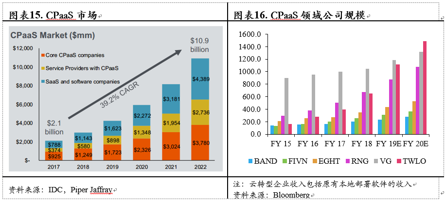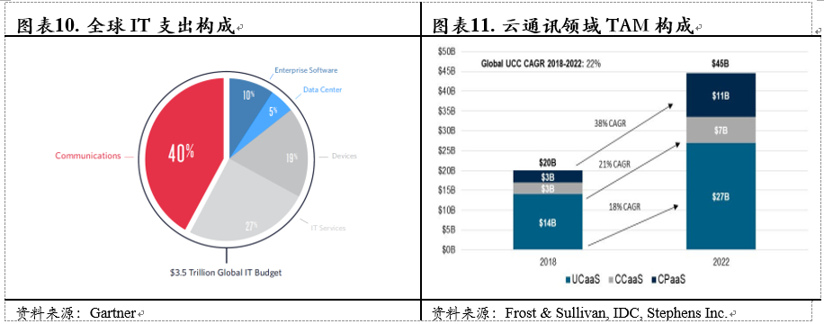 根据Cartner统计,目前全球企业的IT支出为3.5万亿美元,其中40%(约1.4万亿美元)为通信支出。而目前主要的通信产品仍是以本地部署为主(on-premise),在企业上云的大趋势下,整个云通信市场有望在2022年实现450亿美元的TAM,其中UCaaS(统一通信即服务)、CCaaS(联系人中心即服务)以及CPaaS(通信平台即服务)的TAM分别为270亿美元、70亿美元、110亿美元。