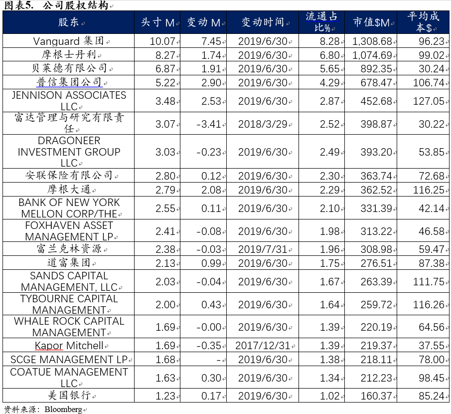 从股权结构来看,先锋集团为公司第一大股东,持股比例8.28%。另外目前持股的著名机构还包括大摩、贝莱德、普信等。近一季机构以增持为主,最大手笔的为先锋集团的745万股增持,总金额约为10亿美元。