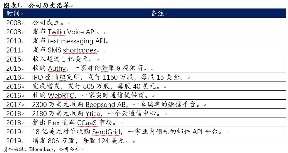 公司成立于2008年;2008-2011年间先后推出了语音、文字以及短信API,极大地减轻了中小企业在通信方面的成本压力;2015年收入超过1亿美元;2016年公司完成美股IPO,募集资金1.72亿,并在同年完成增发;2018年推出Flex进军CCaaS市场;2019年完成约10亿美元的增发以及对SendGrid的收购。