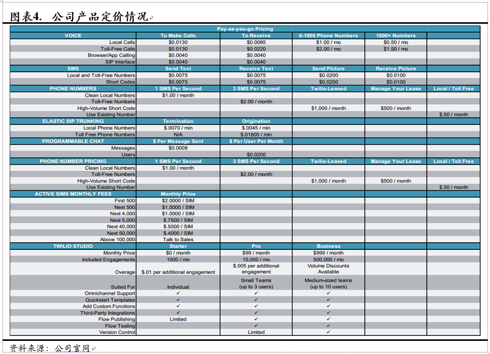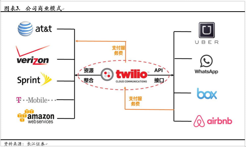 在商业模式方面,Twilio主要通过向用户收取号码月租、通话费与短信费等实现盈利,其上游企业为电信运营商和AWS,电信运营商主要为其通道资源,AWS则为其提供几乎全部云基础设施。Twilio核心竞争力在于其高超的整合与标准化输出技术,以高稳定性、高便捷性、低价格赢取客户的信任。