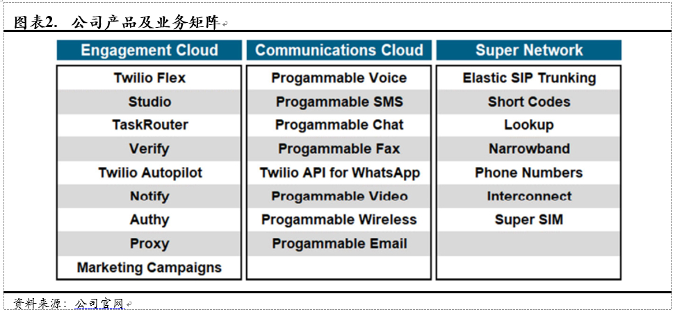 Twilio主要提供数字化或可编程的语音和消息通信服务,2013年引入视频、聊天、Facebook Messenger等数字通信渠道。Twilio的平台包括三个层次:Engagement Cloud(交互云)、Programmable Communications Cloud(可编程通信云)和Super Network(超级网络)。