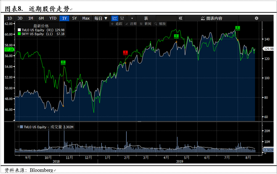 得益于近两年来的高增长,公司2018年以来走出了4倍的上涨行情,目前估值接近20倍PS,位于云计算行业前列。但是从毛利率的角度来看,由于商业模式的原因,基本维持在55%且上升空间有限,这无论是与云计算企业(~70%)亦或是与通信领域云转型同行(~65%)相比,均处于较低水平,而公司的长期目标毛利率也仅是60%-65%,将成为抑制公司估值进一步上涨的主要因素。因此在估值上我们采取了较为保守的分部估值法,SendGrid参照其收购价格18亿美元进行估值。Twilio则根据高盛的预测,基于2019年的预测值9.05亿美元收入以及2020年34.25%的收入增长预期,给予19年收入17倍的PS。