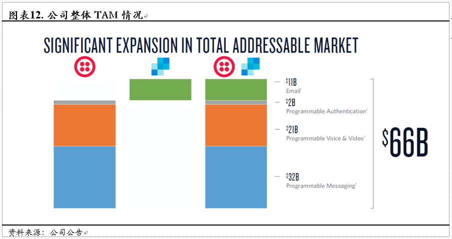 在公司的角度上,公司认为,其收购SendGrid之后TAM显著增加,总体能够达到660亿美元。这与市场上的预期相差较大,我们将其视为公司目前业务的天花板。公司收入水平对应的渗透率为2%左右,考虑到通信市场的巨大容量以及地域之间的巨大差距,预计公司最终以10%的市场份额成为行业龙头,增长空间在5倍以上。