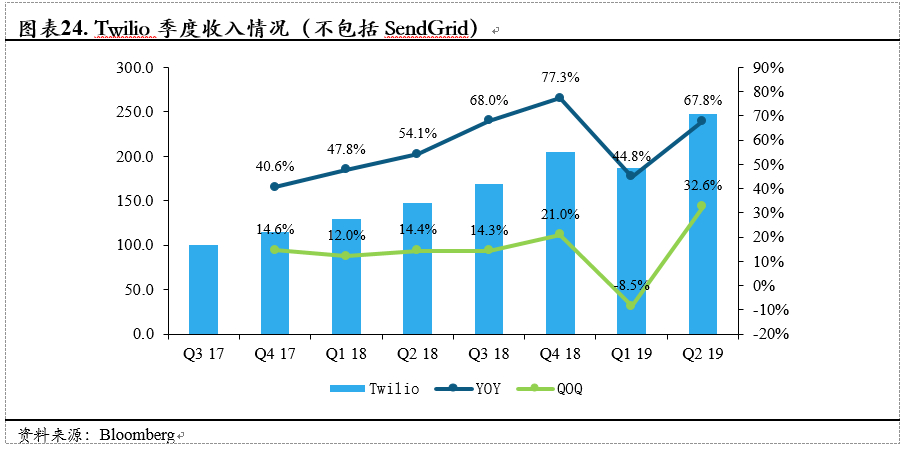 虽然SendGrid在二季度收入仅有2700万,为一季度的59%,为公司整体增长埋下一定隐患。但从twilio单独的收入来看,19Q2收入在一季度的短暂低迷之后迅速回归高增长,剔除SendGrid并表的影响,公司二季度收入同比增速能够达到67.8%。环比增速创近两年的新高,同比也处于次高点。可以理解为公司在收购SendGrid后获得大量的用户基础,进而打开了原有业务的增长闸口,从而二季度出现的收入的爆发式增长。因此即使SendGrid的收入增长并不这么喜人的情况下,我们依旧认为公司的这笔收购产生了较好的协同效应。