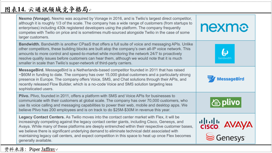 1)Vonage,2016年收购Nexmo进入CPaaS市场,目前是公司最大的直接竞争对手,规模大约是公司的1/3。该公司拥有43万注册开发者,在价格方面比Twilio略低。