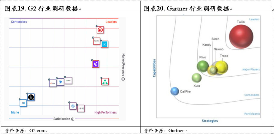 从行业的调研来看,无论是消费者使用体验,公司口碑以及规模等,公司都是CPaaS领域的领跑者。从用户体验上,G2.com很好地记录了各个CPaaS平台的用户反馈情况,从结果来看,公司产品在用户渗透率上是行业最高的水平,而在使用体验也仅以微弱的差距落后于Bandwdth和Plivo。而Gartner的调研更注重于规模以及行业口碑,在其魔力象限中,公司是当之无愧的行业第一。