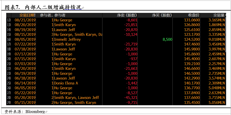 近三个月的内部人二级市场交易以减持为主,主要由于公司的股权激励授予公司内部人相当部分的股票。值得关注的是公司股东Jeffrey R Immelt(GE前董事长)今年8月以124.52美元的价格在二级市场购入8500股公司股票,价值约100美元,这也使得公司成为少数几家有内部人在二级市场买入动作的云计算企业。