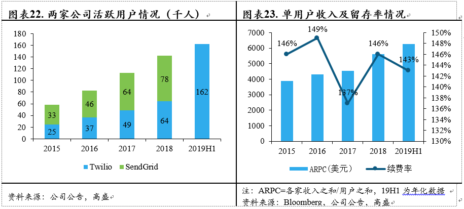 公司2019年完成了对SendGrid的收购,Q2 19是公司并表以来第一个完整的季度,SendGrid的收购给公司带来了1倍多的用户增长,根据各家公司的披露,SendGrid的续费率为110%左右,twilio的为146%,两家公司合并用户量完成了翻倍增长,而从twilio 19H1的续费率数据来看并没有因为SendGrid的并入而被大幅拉低。另外基于回溯调整后的ARPC(单客户收入)值来看,两家公司合并之后APRC出现了进一步的抬升。对此可以理解为合并之后两家公司之间的交叉销售情况有所增长,从而带来SendGrid的续费率提升以及Twilio的续费率保持稳定。