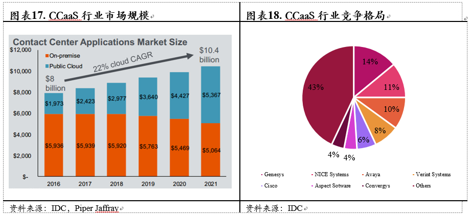 公司2018年发布Flex之后正式进入联系人中心市场(CCaaS),目前CCaaS的主要服务还是以本地部署为主。根据高盛以及IDC的预测,2022年本地以及云部署的CCaaS服务占比将由70%/30%发展为51%/49%。而根据Piper Jaffray的预测,2021年时部署在云端CCaaS的TAM将达到54亿美元,年复合增长率22%。而目前主要的份额集中在Gensys,NICE system以及Avaya等企业手中,虽然说CR5高达49%,但是尾部市场的份额仍旧比较分散,同时云化的趋势也会很好助力公司CCaas业务的突围。