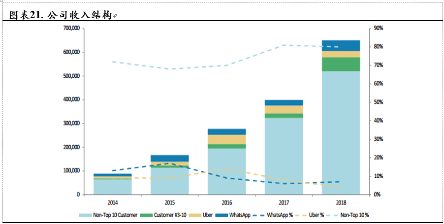 公司上市之后,前期市场比较担心的客户过于集中的问题得到较大的缓解,Uber以及WhatsApp的收入占比均出现一定的回落,目前均在10%以下。而对于企业用户,自2017年以来,前10%以外的客户收入占比均保持在80%,可以看出公司收入的大客户依赖程度已经降至一个较为合理的水平,同时18年TOP 3-10的客户收入快速增长,公司在行业中口碑正快速建立。