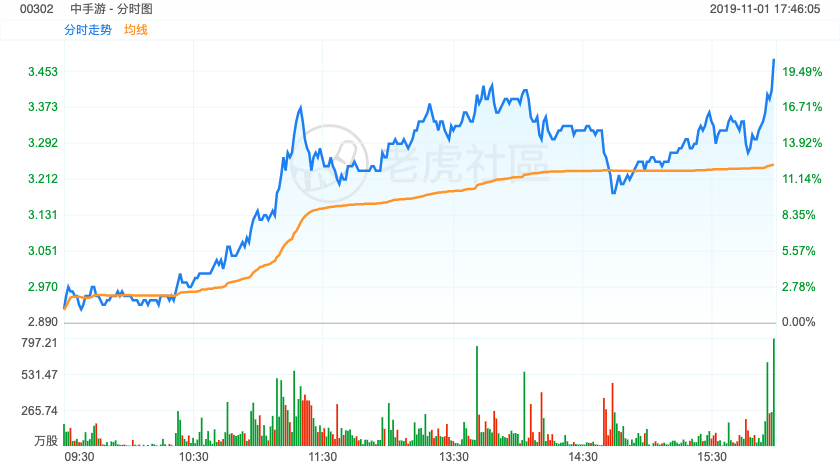 10月31日上午9:30,中手游联合创始人肖健、冼汉迪在香港交易所敲响铜锣。其发售价定为每股H股2.83港元,认购合共250亿股香港发售股份。收报2.89港元,较上市涨2.1%,全日成交4.24亿股,涉资12.7亿港元。今日中手游引来了爆发,全日大涨20%。