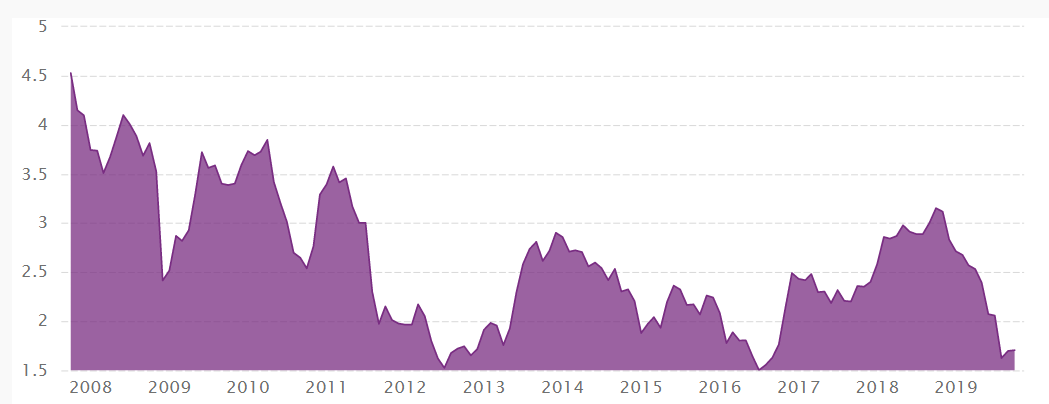 利率的表现一路向下,较低的利率也就意味着较低的折现率,而对于成长型股票来说,更低的折现率代表着未来高收益的现值也更高,也就是整体估值更高。