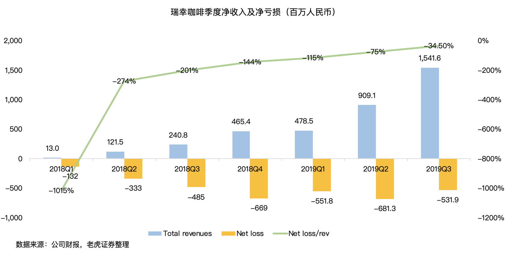 2019年第三季度瑞幸的净收入15.4亿元人民币,同比增长暴增540%,环比增长也达到了70%,可谓是非常亮眼。收入暴涨的同时,亏损并没有如预期的持续放大,第三季度瑞幸净亏损5.3亿元人民币,,虽然较去年同期的净亏损4.85亿有所放大,但较上季度亏损6.8亿已有明显缩窄。