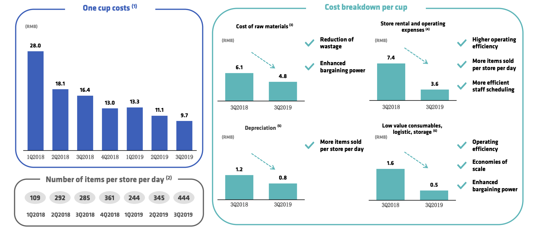 第三季度瑞幸的单杯原材料成本降至4.8元,加上边际成本为5.3元,。如果算上门店的房租和运营成本等(不算市场推广费用),单杯综合成本降至9.7元,首次低于单品价格。这也是瑞幸门店盈利的关键所在。