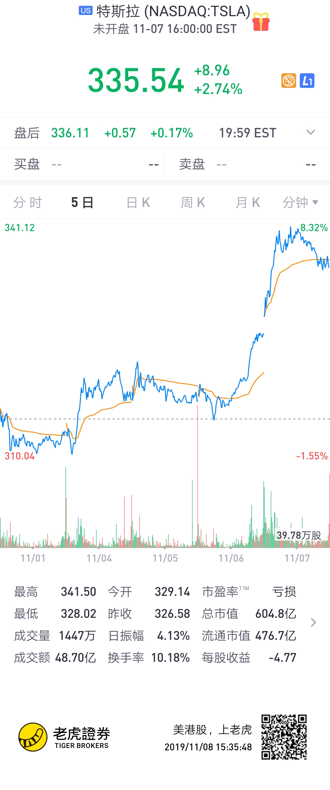 特斯拉股价从本周的314.5美元,涨至335.54美元,涨幅达7.1%。据老虎证券APP的财务分析得出,仅11月4日~7日,3天时间从股市涌入特斯拉的资金超过4500万美元。