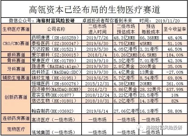高瓴资本的格局非常大,不是看一时一地,高瓴就擅长选择历史大趋势布局,15年左右,高瓴资本就进入国内的创新药四杰“恒瑞,百济,信达,君实” ,恒瑞通过二级市场进入,其他三家都是一级市场进入,为了便于跟踪,这三家公司的进入价格我是按IPO价格 计算的。如果按一级市场进入价格计算 高瓴资本的投资收益会更高 ,可以参考“投资高阶--自上而下的赛道方法论”。