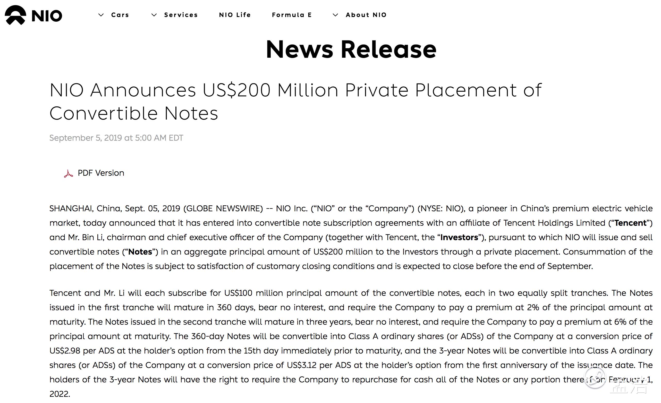 根据该协议,蔚来汽车将通过私募方式向投资者发行和出售总额为2亿美元的可转换债券。此次债券发售预计将于今年9月底前完成。腾讯旗下的附属公司和李斌将分别认购1亿美元的可转换债券本金,且各自分两次平均认购。第一批发行的债券将在360天内到期,不会产生利息,但要求蔚来汽车在到期时支付本金2%的溢价。第二批发行的债券将在三年内到期,也不会产生利息,但要求蔚来汽车在到期时支付本金6%的溢价。360天期债券将可转换为蔚来汽车的A类普通股(或者ADS),转换价格为每股2.98美元,在到期前第15天起由持有人选择是否兑换;三年期债券在发行一周年后可根据持有人的选择,以每股3.12美元价格转换为蔚来汽车的A类普通股(或者ADS)。而且,三年期债券的持有人有权要求蔚来汽车于2022年2月1日以现金回购全部或部分债券。