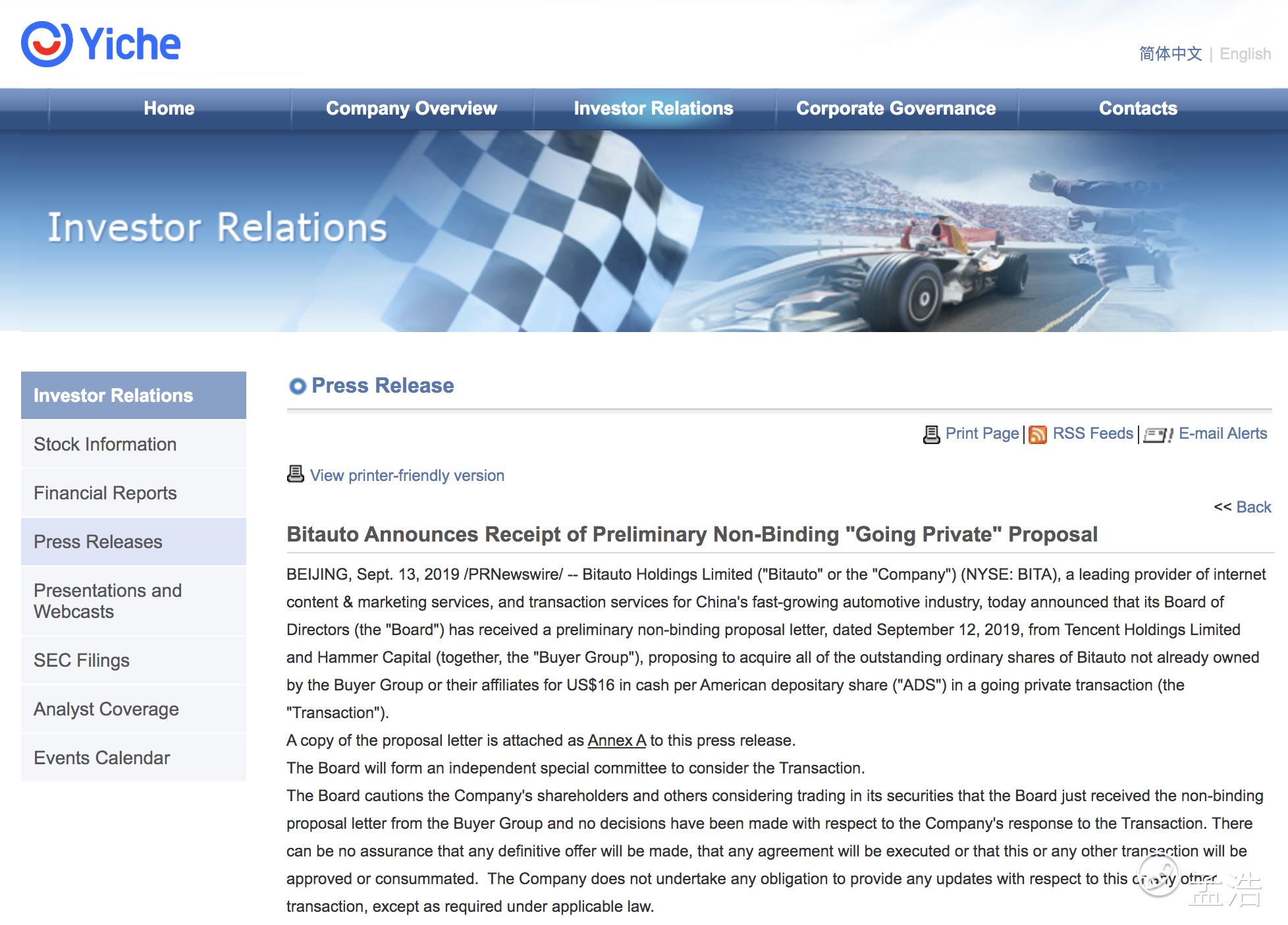 除此之外,9月13日易车网$易车网(BITA)$ 发布公告称,已收到腾讯控股和Hammer Capital初步、不具约束力的要约,两者将组成买方团,拟以每股或者每ADS 16美元的现金溢价30%收购其尚未持有的易车网流通股票。