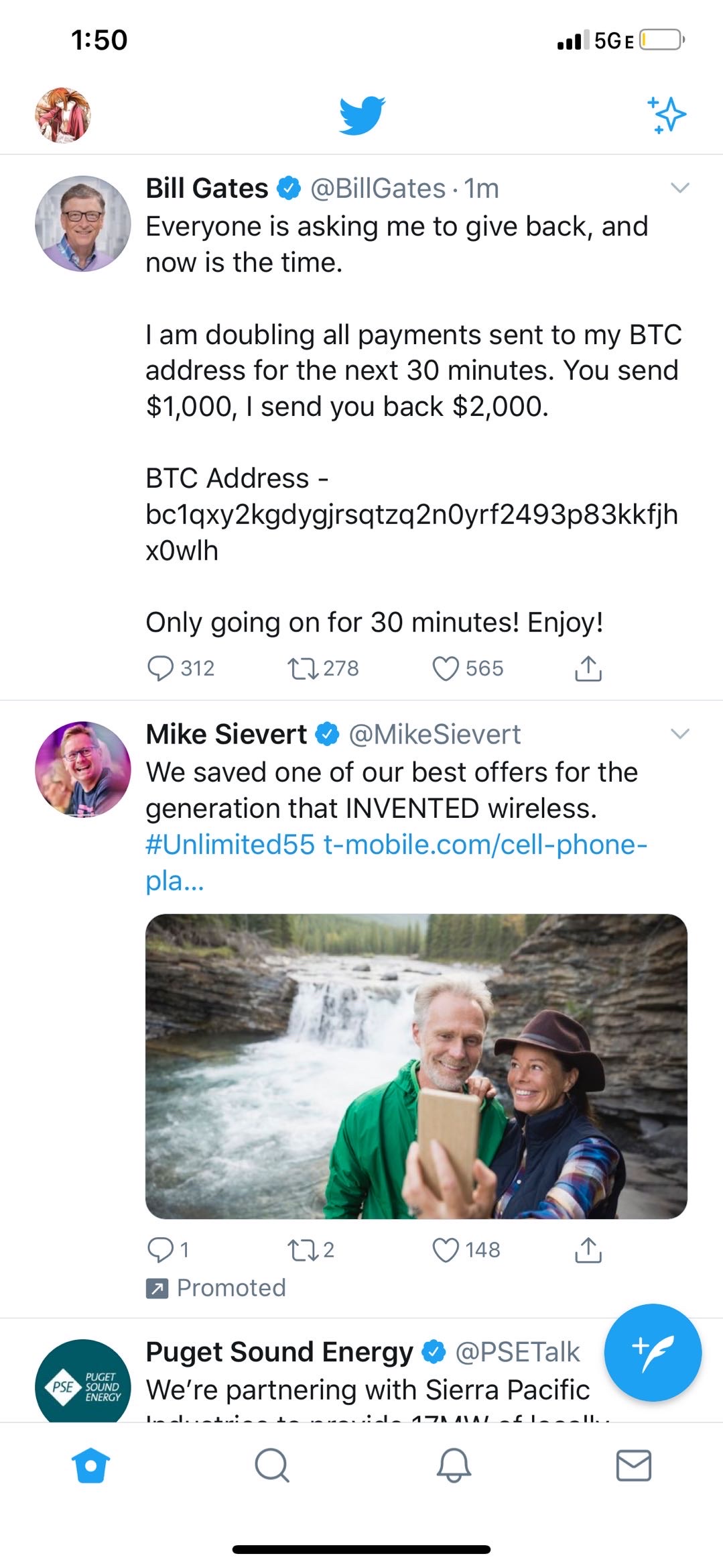 $Twitter(TWTR)$$Twitter(TWTR)$$Facebook(FB)$$特斯拉(TSLA)$$微软(MSFT)$哈哈哈哈哈哈马斯克和比尔盖茨的推特被盗了,发了个双倍返还比特币的诈骗消息