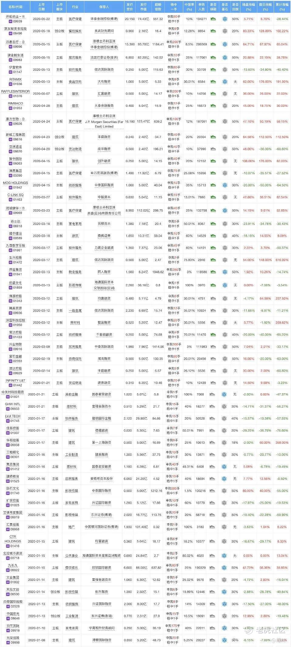 影响打新的收益,主要是两个方面:“中签率”和“上市后的表现”(关于这个可以参考历史文章“如何提高中签率?”)。下图是2020年上半年港股新股上市后的当天涨幅,可以带大家快速了解港股打新市场。