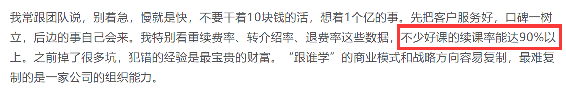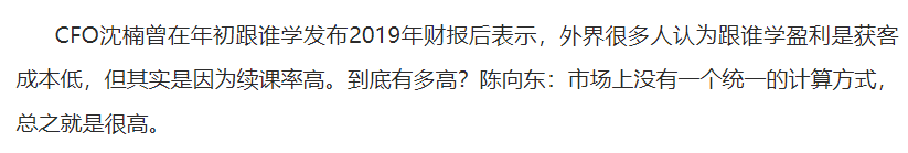 当行业平均续费率为50%的时候,跟谁学的续费率可以高达85%。所以当有70%虚增学员时,跟谁学的续费率会大大超过市场正常水平。跟谁学目前并未提供其续费率的准确数字,但是我们可以参考以下信息。