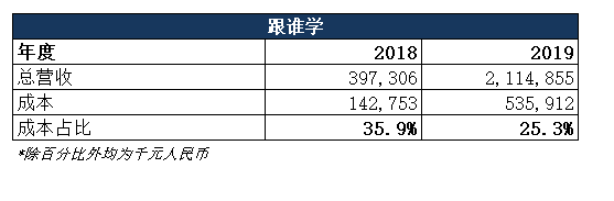 可以看出跟谁学的主营成本占比远小于新东方在线和网易有道,其2019年的主营成本占比25.3%只有新东方在线和网易有道的1/3。我们知道大多财务造假公司的一个特征就是主营成本占比低(毛利率异常),而跟谁学非常符合这个特点。下面我们分析一下跟谁学超低的主营成本占比是否合理。