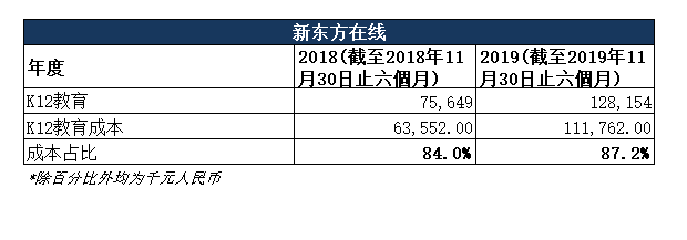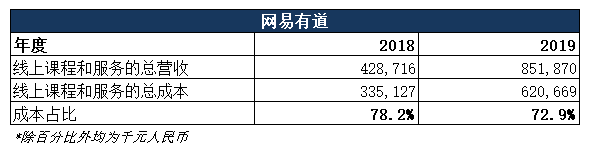 目前同样采用双师大班模式的上市公司有好未来(旗下学而思),新东方在线,网易有道等。好未来财报中没有单独列明线上课程主营成本,新东方在线和网易有道财报中有单独列明的数据,我们计算一下这2家公司的成本占比: