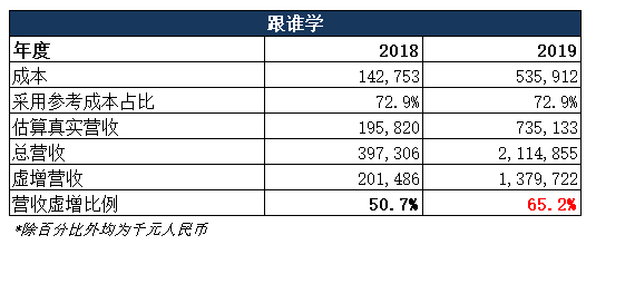 根据计算,跟谁学18年虚增营收2亿人民币,19年虚增营收13.8亿人民币,其中19年虚增营收比例65.2%。同时我们的估算数据还可以与另外2个数据相佐证。