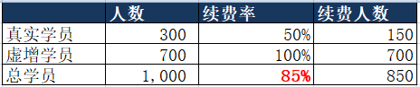 我们按1000个学员,300个真实学员,700个虚增学员,行业真实续费率50%,虚增学员续费率100%来计算一下跟谁学的续费率