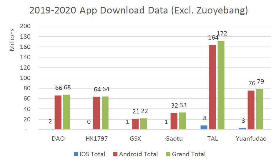 2)根据七麦数据网提供的年度APP下载量,跟谁学(包括跟谁学APP和高途课堂APP)与网易有道的有道精品课APP下载量接近。表明2家公司的线上课程真实学员数量接近。假设规模化在线教育机构的课程收费相差不大,这2家公司的营收应接近。这与我们测算结果相吻合(2019年跟谁学真实营收7.4亿人民币,网易有道营收8.5亿人民币)。