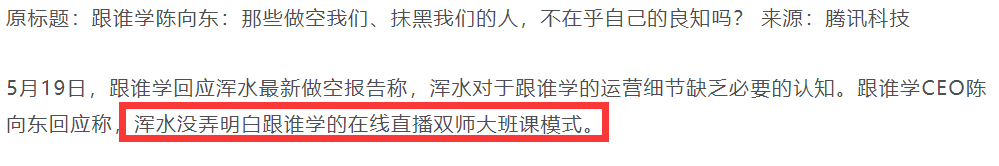 双师大班模式是跟谁学主要宣扬的另外一个所谓竞争优势,跟谁学董事长陈向东甚至认为“双师大班直播课的模式是连大名鼎鼎的浑水没弄明白的”。