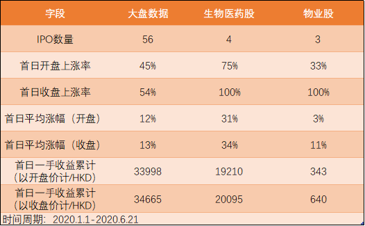 港股市场对生物医药股、物业股这2类股票认可度是比较高的。以2020年上半年数据为例,生物医药股和物业股首日收盘收益率都是100%,也就是首日卖出都能吃到肉。