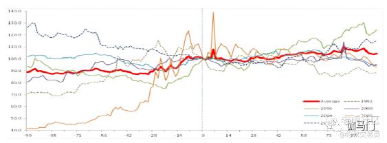 下图为历次美国大选前后全球主要10个国家(G10)外汇汇率的隐含波动率的走势。