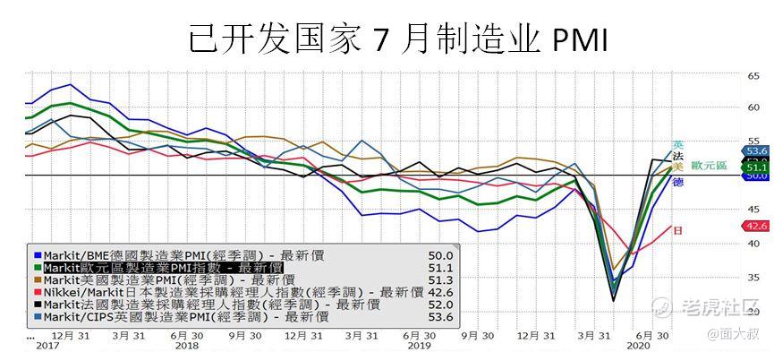 德国7月制造业PMI 50.0,优于预期的48.0,更较6月45.2大幅上升回到景气荣枯值,欧元区7月制造业PMI 51.1,优于预期的50.1,也较6月的47.4大幅上升,美国51.3低于预期的52.0,较6月49.8成长,英国表现最好53.6优于预期的52.0,较前期50.1微幅成长。在各国陆续解封经济重启下制造业PMI普遍连续3个月改善,欧元区各国由于疫情控制得当制造业PMI普遍回到50荣枯值之上,不过因为新冠肺炎疫情不只在美国大爆发,欧洲部分各国也有疫情重燃之势,虽然疫情规模比美小学的多,欧元区第三季制造业PMI会持续维持在50之上但成长趋缓。美国虽然7月数据回到51.1未受到多州解封进展倒退的影响,不过以现在疫情持续扩大甚至7/24超过150位顶尖卫生专家联合上书美国政府要求美国重新封锁的状况来看,美国的新冠肺炎疫情不容乐观,即使制造业PMI回到50之上能持续的期间也不久,或者顶多在50上下震荡。
