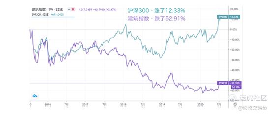 通过观察建筑行业指数和沪深300指数变化,可以发现建筑行业在2017年以前还能和大盘同步成长,在2017年之后就开始逐渐跑输大盘了。