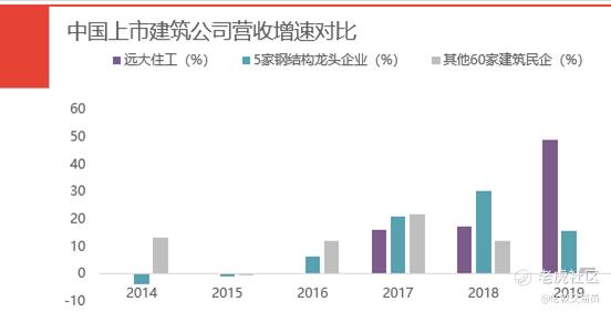建筑民企的营收增长能力在逐步下滑,但是鸿路钢构所属的钢结构公司和远大住工所属的预制混凝土(PC)结构公司的营收却在加速增长。