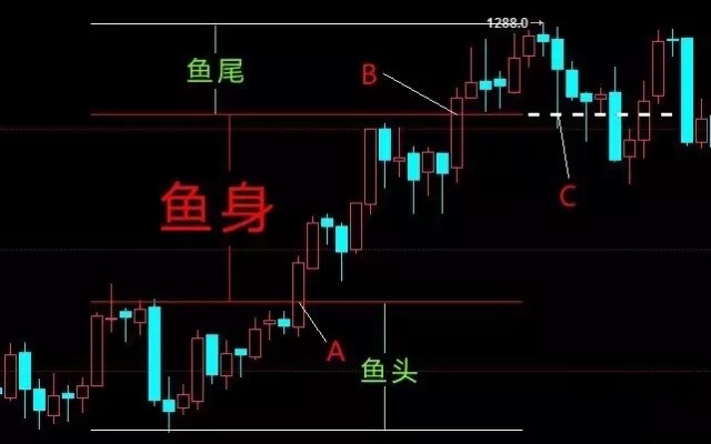 从图上看,行情突破前高冲过A点,从A点向上冲到B点则为鱼身,但是在实际的操作中,我们是没办法确定B点的。