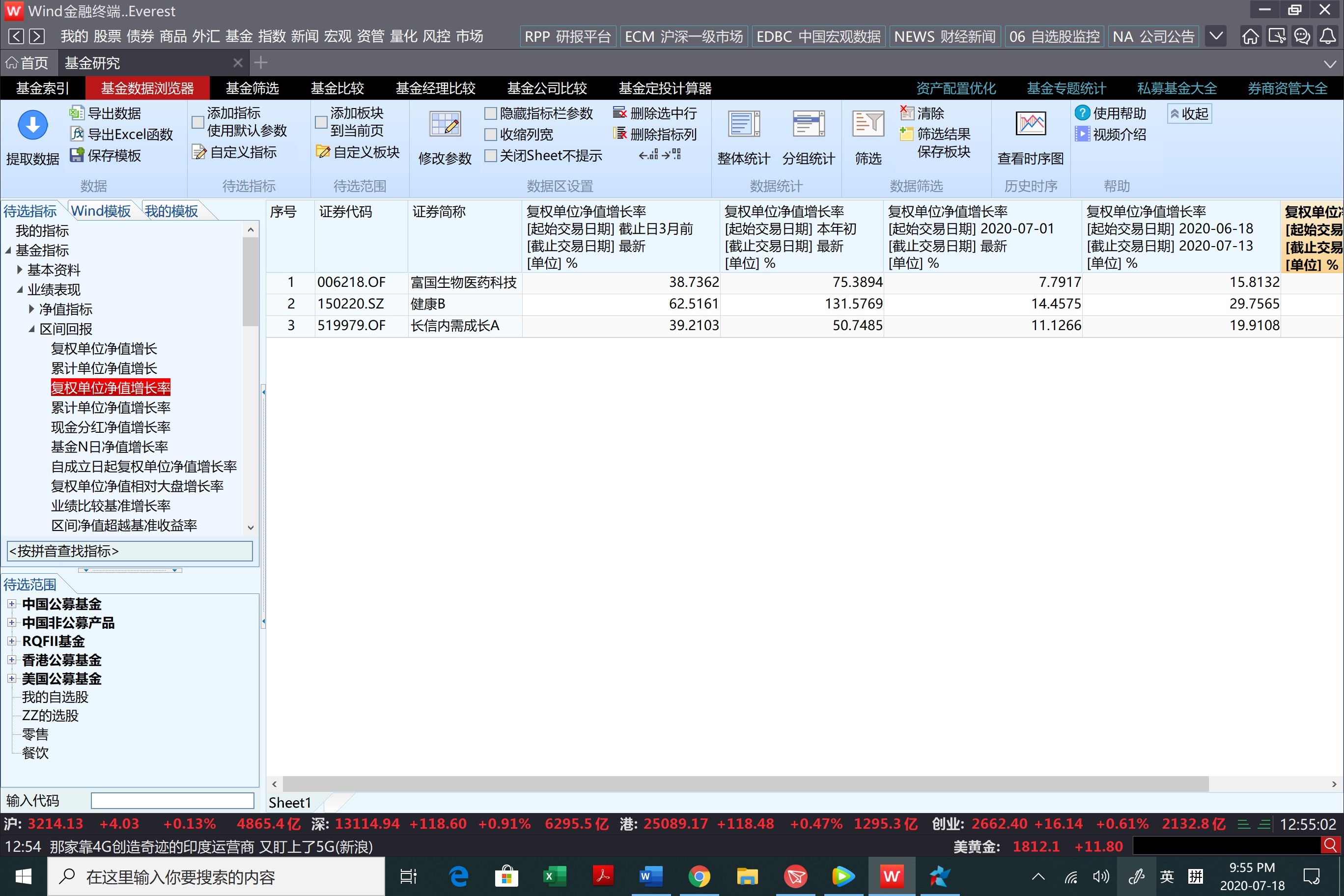 大家可以看到前海开源中证健康B基本跑赢长信内需(食品饮料)和富国生物医药科技。从3月复盘以来,健康B回报率62.52%最高,富国生物38.74%与食品饮料基本持平,6月18日牛市开始到7月13日大回调前也是健康B领跑。当然这肯定归功于疫情影响。唯独在7月14日开始回调后到7月17日,我发现(wind有部分由于屏幕所限没展示)回调中健康B被刷掉了,回报率直降到-1.96%,不过富国也好不到哪去也是-1.79%。我看了下跟踪误差(风险指标),健康B的跟踪误差几乎是富国的2倍,这说明健康B风险较高。我接下来深入看下健康B的基金经理选股和择时能力。从7月7日第一次7月以来大盘回调来看,健康B的基金经理选股能力最高0.0375,富国生物医药科技基金经理选股能力最低只有0.0232;但择时能力却正好相反,健康B的基金经理择时能力为-37.73,富国的基金经理择时能力为-23.99;信息比率反映了该基金的风险回报率,最好的是富国生物0.92,健康B其次0.76。不过考虑之前的回报率,我觉得健康B还是更好一些。还有就是健康B是在券商App上交易实时交易的,跟买卖A股一样,如果你觉得行情不好,健康B是可以随时跑掉的,不像富国T+2你最好长期持有。不过你选哪一只都可以,反正我在wind里筛来筛去就这两个还不错。