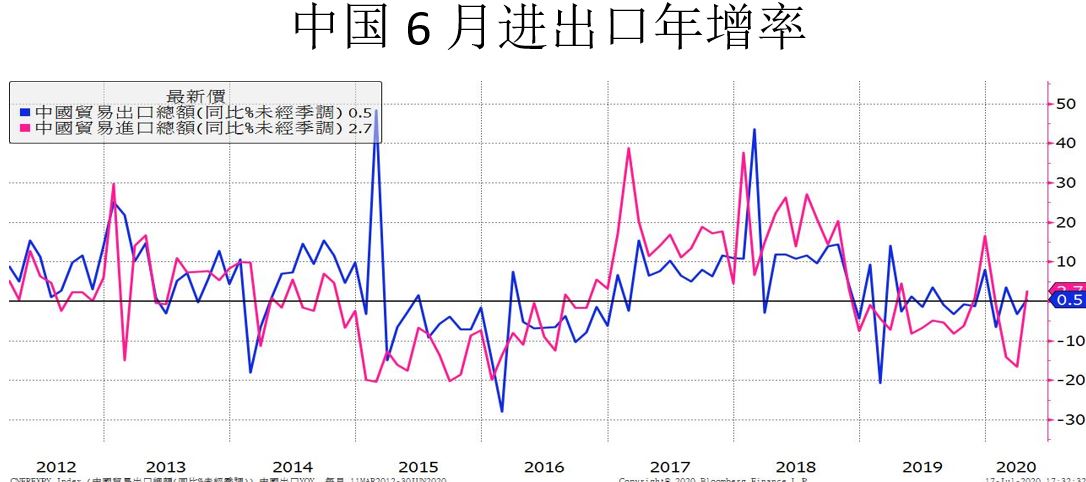 中国6月进口年增率2.7%,较5月-16.7%大幅成长,主要是大幅增加农产品及原物料采购,而且人民币6月升值也有促进进口的效果。出口年增率0.5%则是受惠于防疫物资出口的强劲成长。整体来看6月的进出口年增率都转为正常长,代表中国经济在新冠肺炎解封之后经过2月的努力逐渐回到正轨。