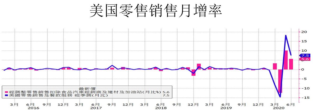 美国6月零售销售月增率7.5%优于市场预期的5.0%,不过较5月的18.2%下滑,核心零售销售5.6%也高于市场预期的4.0%,同样较5月的10.1%下滑。由于5月是解封的第1个月零售销售月增率5月一定是强力反弹成长幅度最大,6月月增率较5月下滑是合理的现象,不过从零售销售总额来看6月5243亿美元已经跟全国封锁前的2月5273亿美元只差距40亿美元,这代表封锁期间积压的消费以及报复性消费带动美国零售销售冲高,但6月下旬美国疫情爆发7月之后美国超过10个州解封进展退回到第一阶段,14个州暂停解封,势必会影响到美国民众的消费意愿,7月零售数据将自6月的反弹高点下滑。